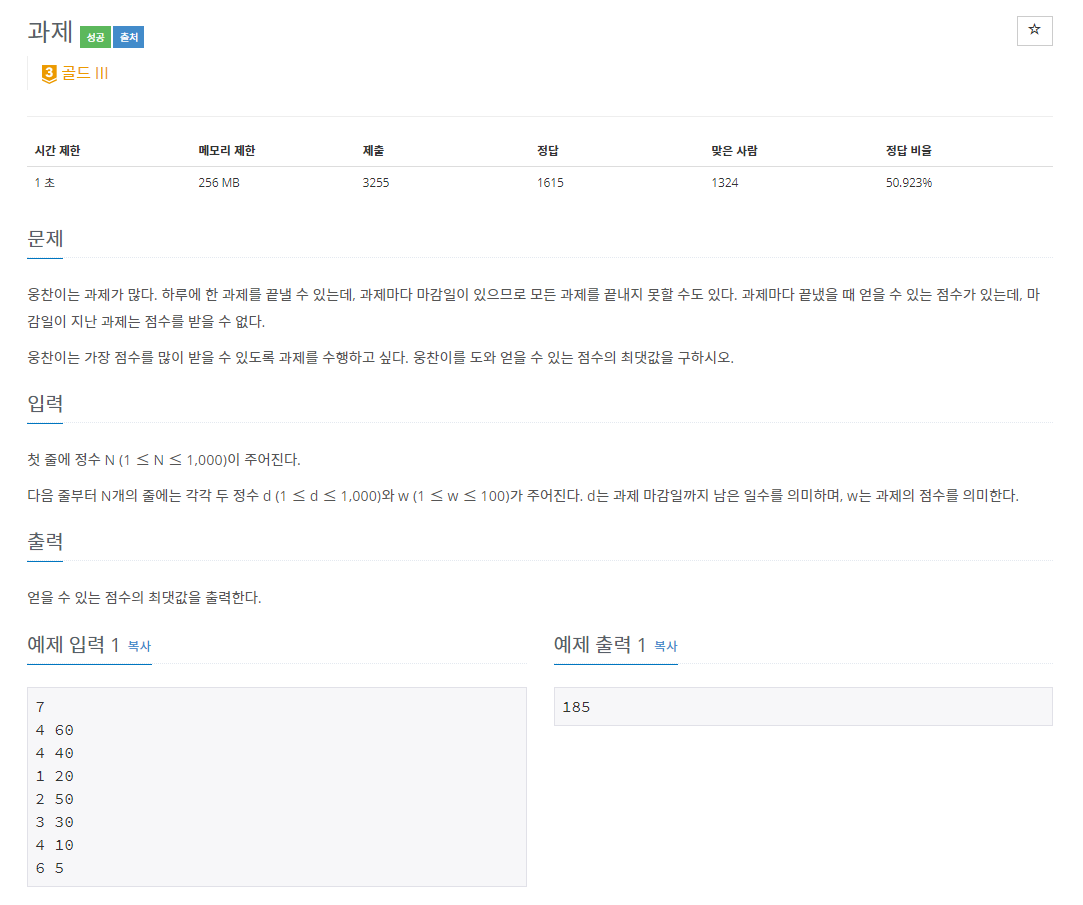 이 문제는 각 과제의 점수와 마감 기한이 주어질 때 얻을 수 있는 점수의 최댓값을 구하는 문제이다. 단, 과제는 하루에 하나씩만 끝낼 수 있다.